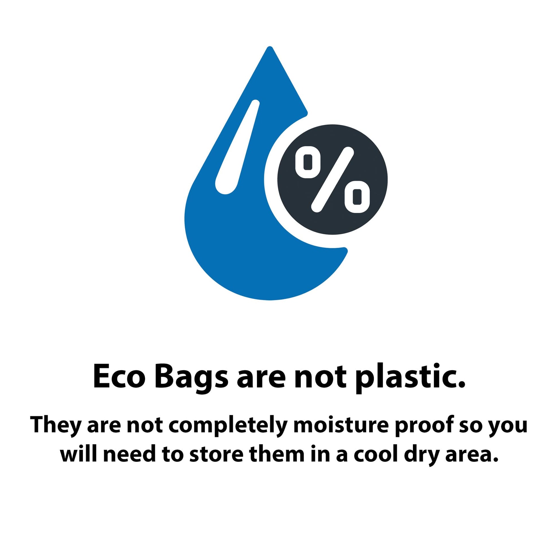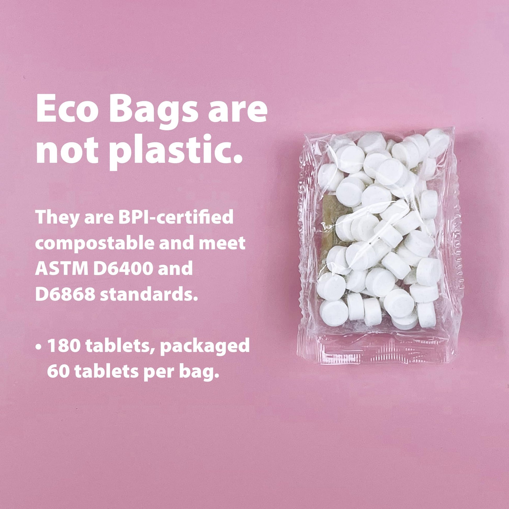 - Eco Bags are not plastic. They are BPI-certified compostable and meet ASTM D6400 and D6868 standards. 180 tablets, packaged 60 tablets per bag.