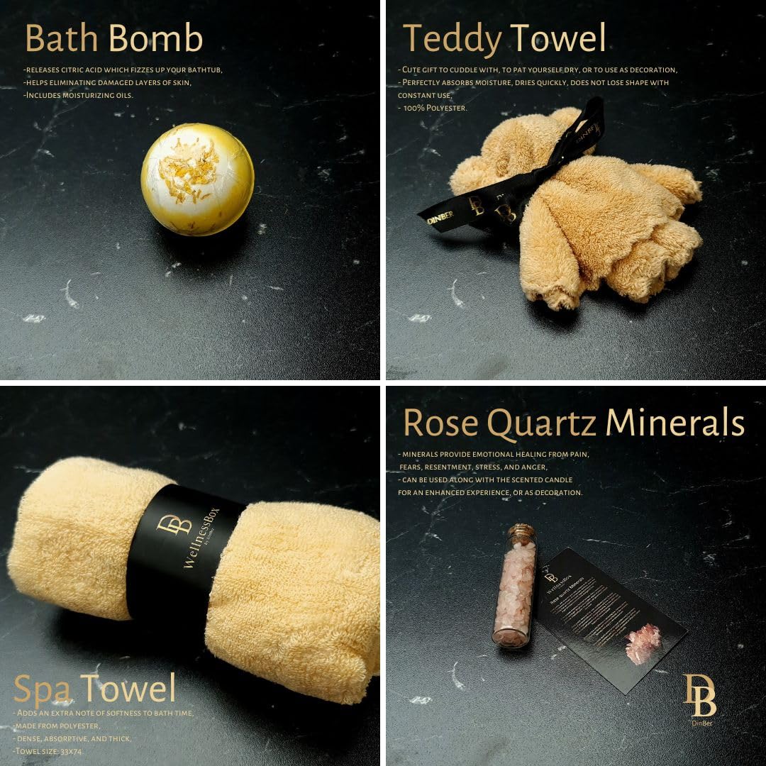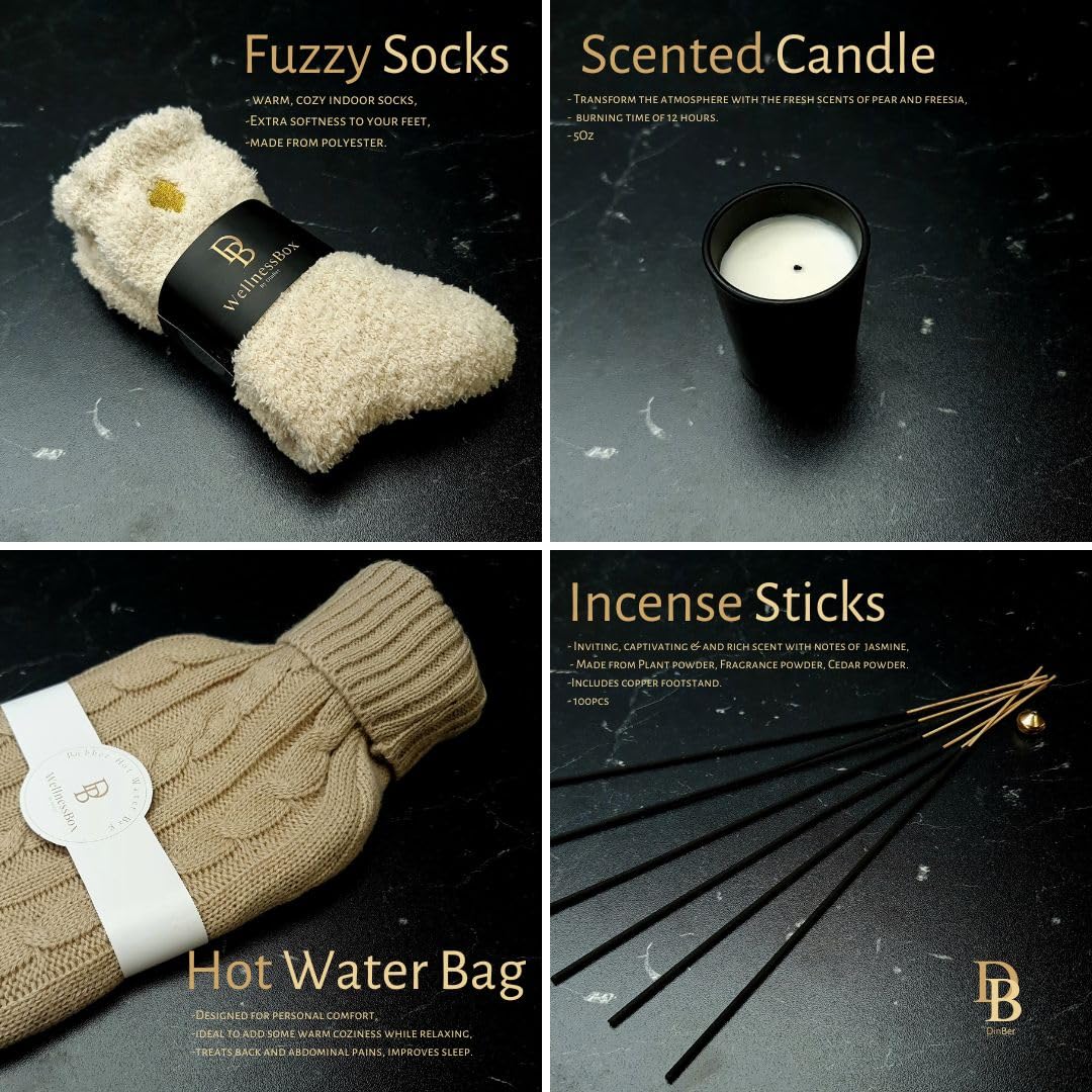 - đ¤ LUXURIOUS SELF-CARE ESSENTIALS â Also inside the spa package: a moisturizing fizzy bath bomb, a silky sleep mask, a soft satin scrunchie, cozy fuzzy socks, a quick-drying teddy hair towel, a hot water bottle for soothing comfort, and 100 incense sticks with calming jasmine notes. It's a complete self-care set that transforms any day into a relaxing retreat.