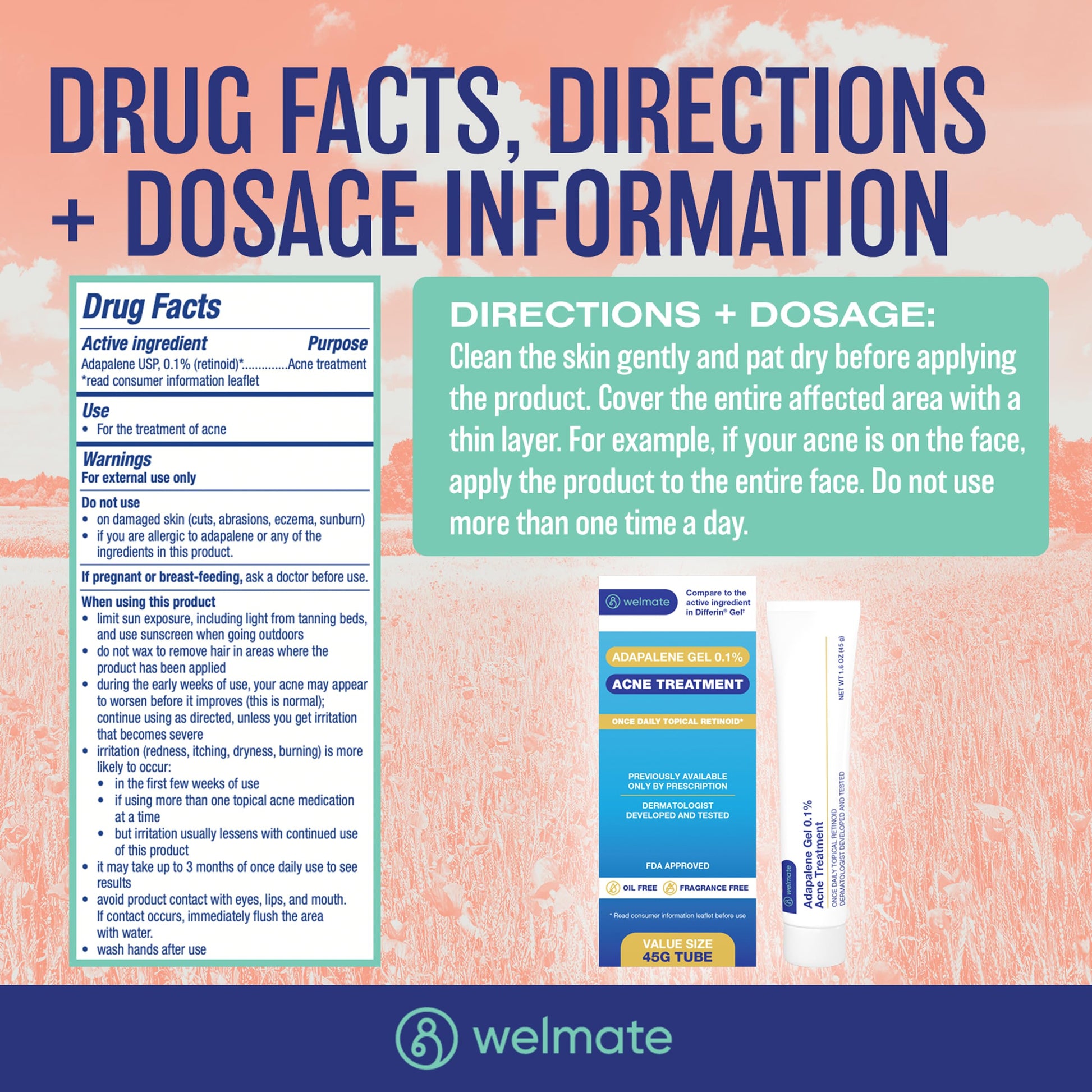 WELMATE - Adapalene Gel 0.1% - Acne Treatment - Skin Care - Daily Topical - Acne Skincare - Pimple Cream - Acne Cream - Oil & Fragrance Free - 1.6oz / 45g
