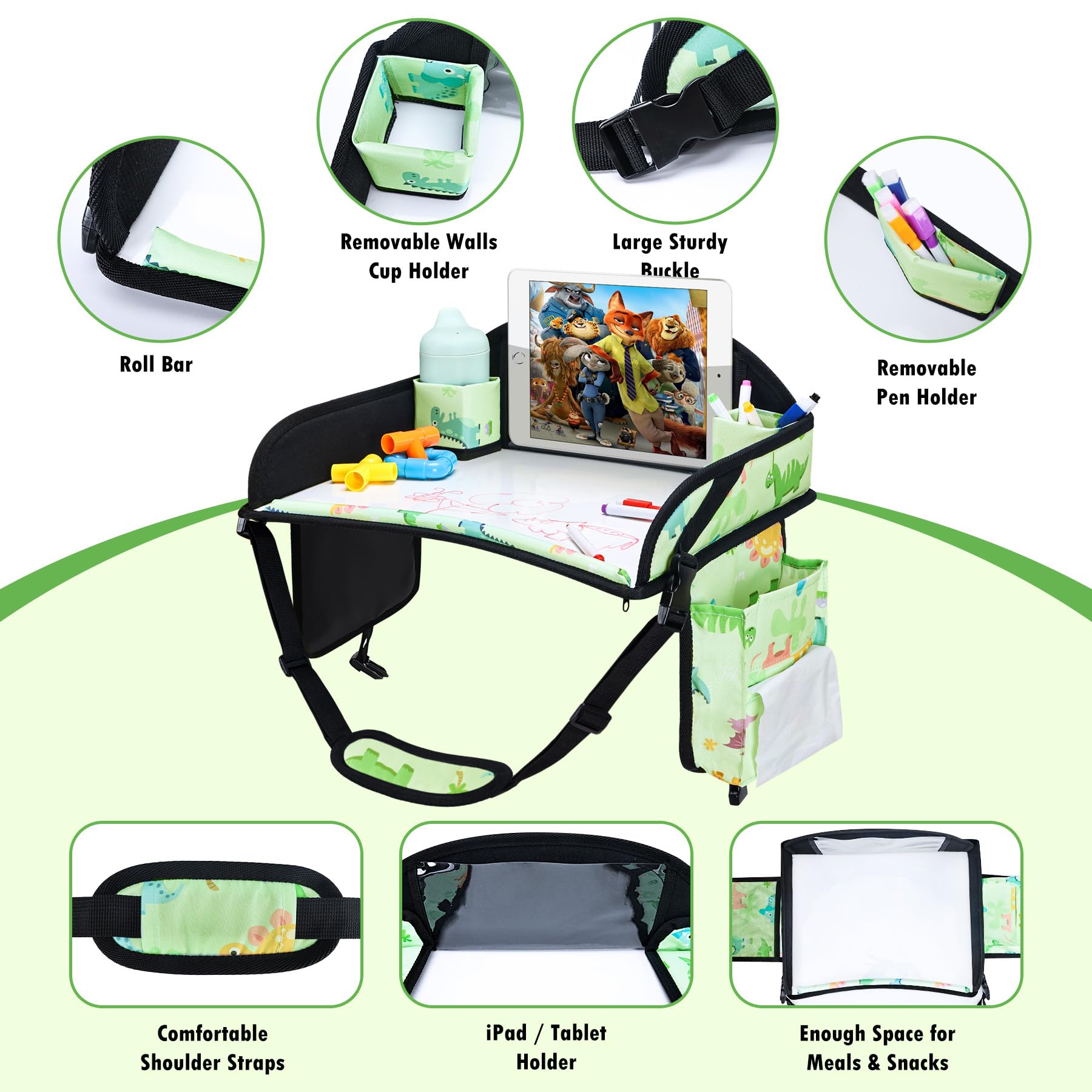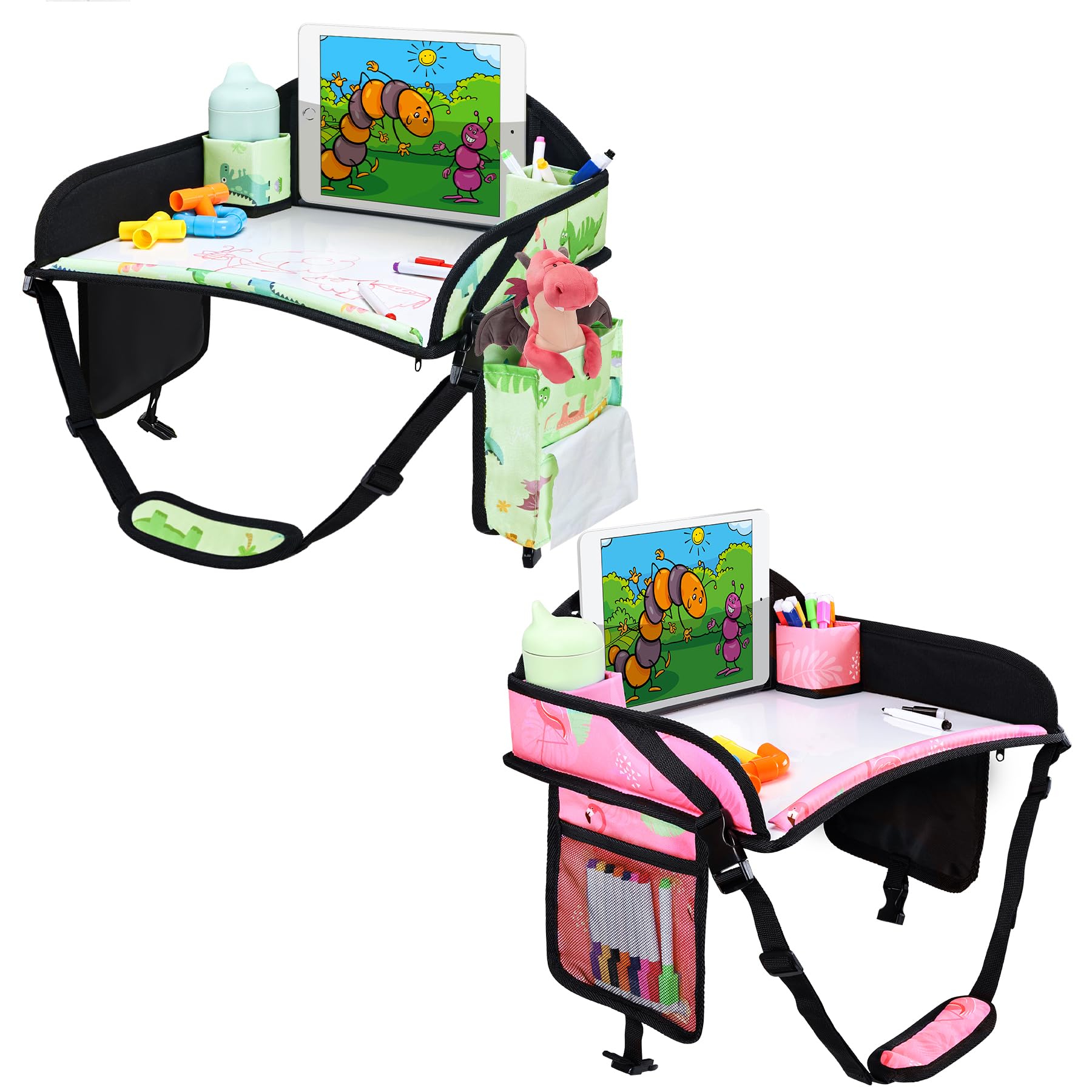 - Multi-Function Travel Tray For Kids Car Seat: Multiple mesh storage pockets keep your child’s toys, snacks and water bottle organized and within reach. The dual-purpose adjustable strap secures toddler travel tray in place and be used as a convenient carrying strap for travel