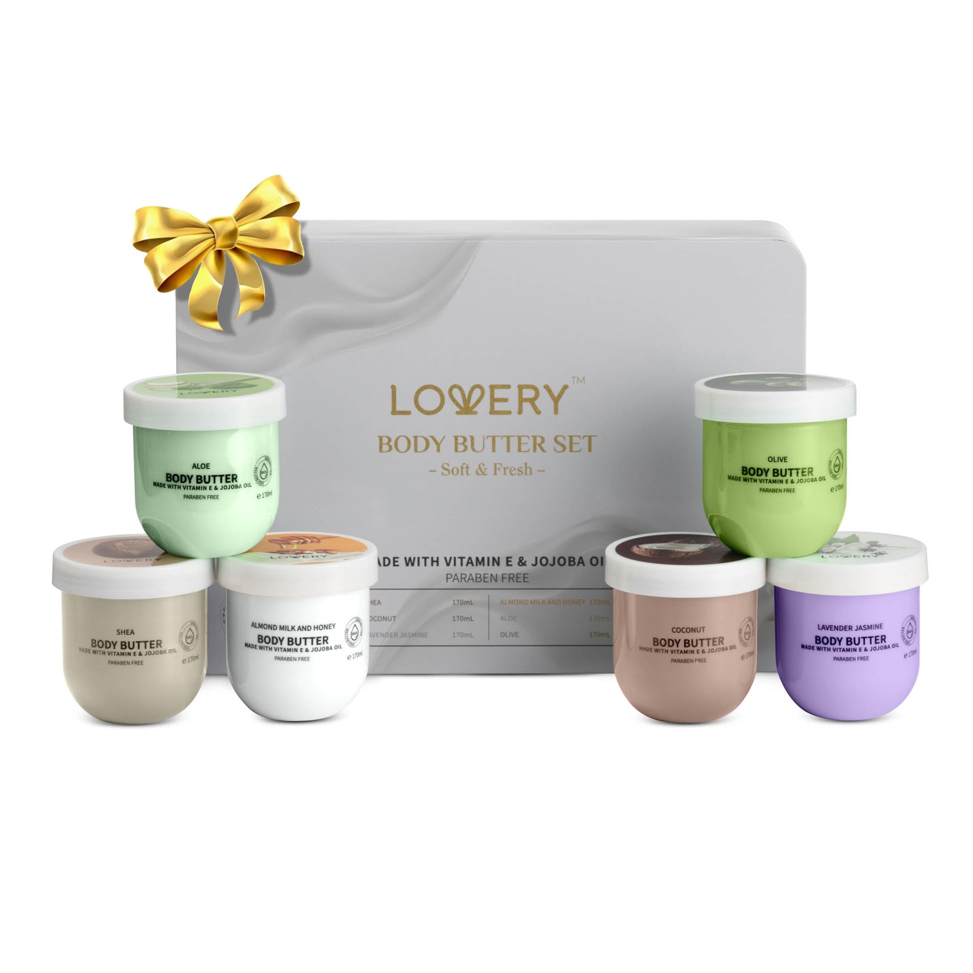 - SCENTED BODY LOTION SET, 6 FRAGRANCES: Choose your favorite Body Butter Scent. Each Body Butter Container has 8oz of Whipped Lotion. From Coconut, Aloe, Olive, Shea, Lavender Jasmine, Almond Milk & Honey.