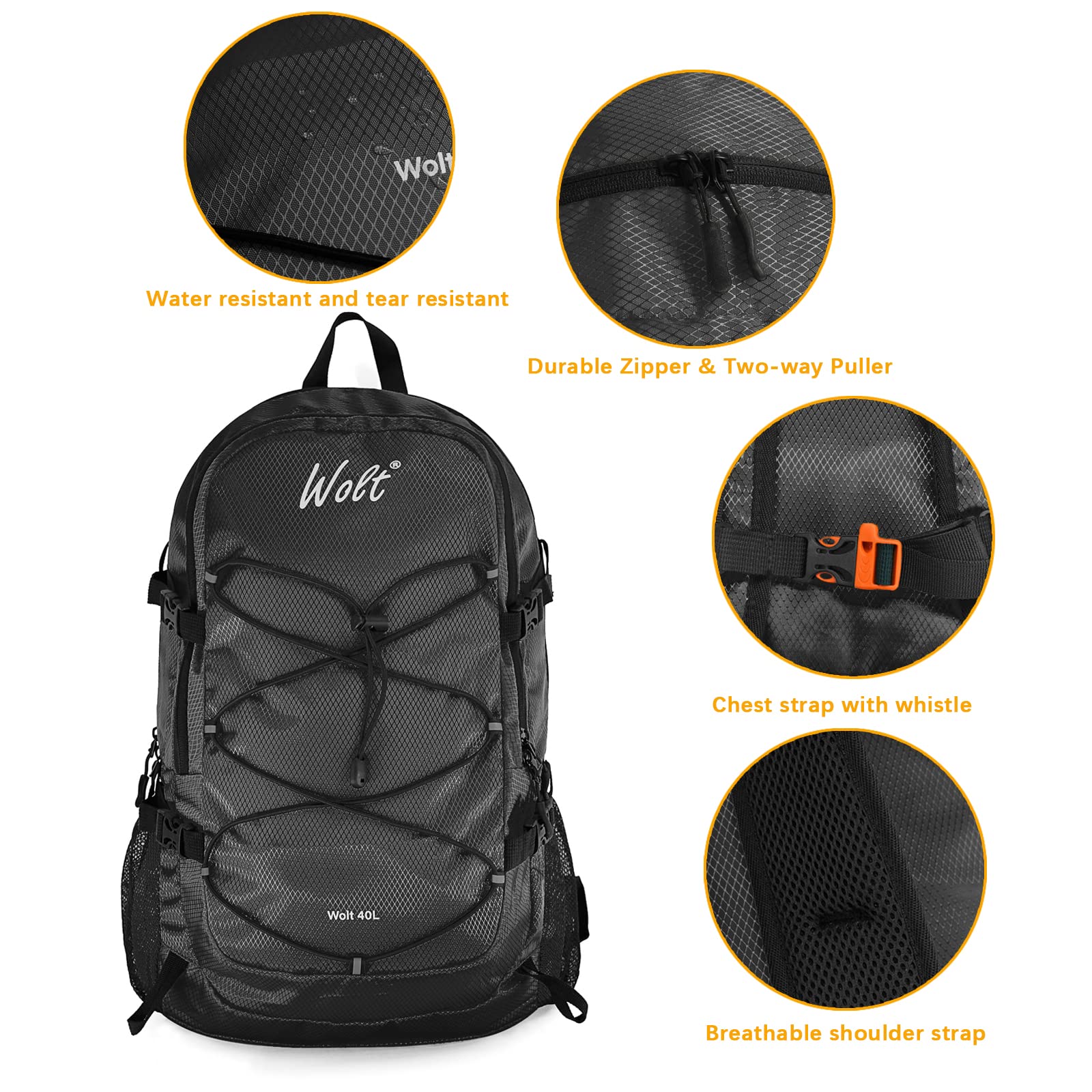 WOLT 40L Packable Travel Backpack, Foldable Lightweight Backpack for Men Women,Waterproof Hiking Bag for Outdoor Camping (Black)