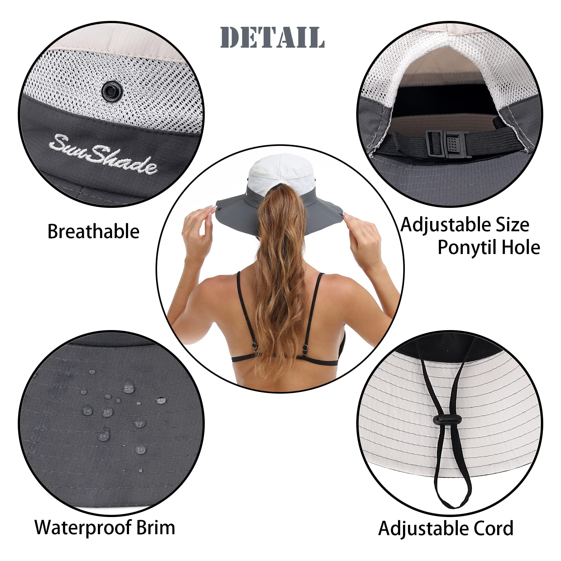 Womens Summer Sun Hat Beach Hat Wide Brim Outdoor UV Protection Hat Foldable Cool Mesh Ponytail Bucket Hat (Grey+Beige)