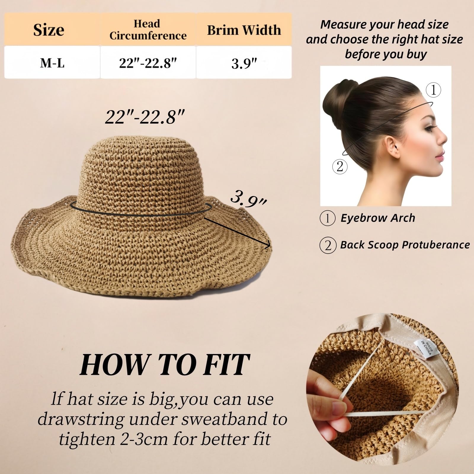 Womens Sun Hats Wide Brim Summer Beach Hat for Women Foldable Travel Fedora Handmade Crochet Straw Hat Packable UPF50+, Khaki