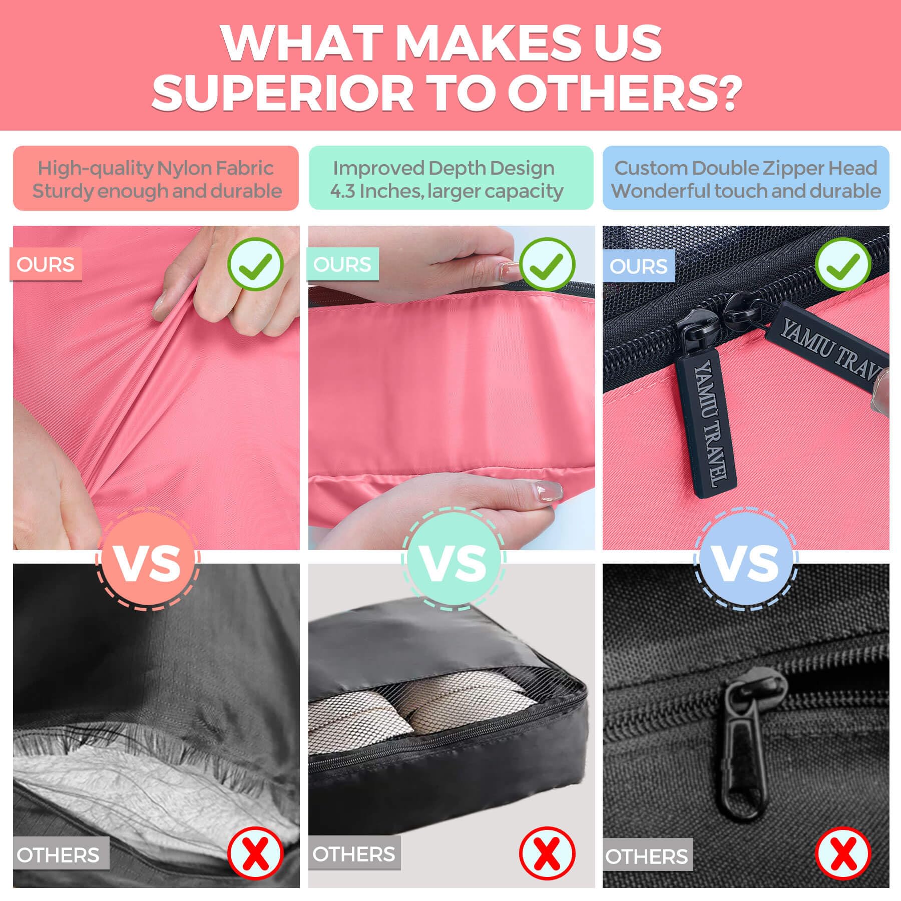 - Sturdy Material & Strong Zippers: Our luggage organizer bags are made of upgraded nylon fabric, they are sturdy, super lightweight and easily washable; Besides, the zippers are high quality and zips up smoothly and durable; The zipper pulls are also customized and made of rubber for easy holding. If you give us a chance for trying you would find that our travel cubes are much more long-lasting than others'.