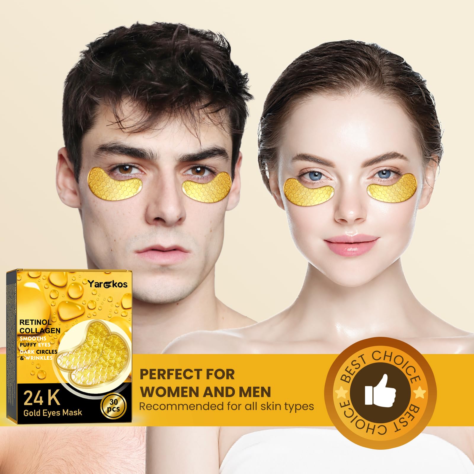 Yargkos 30 Pcs 24K Gold Under Eye Patches Kit, Collagen Golden Eye Mask for Puffy Eyes, Dark Circles, Women Travel Undereye Gel Pads for Puffiness Wrinkle, Men Cooling Hydrating Eye Skin Care