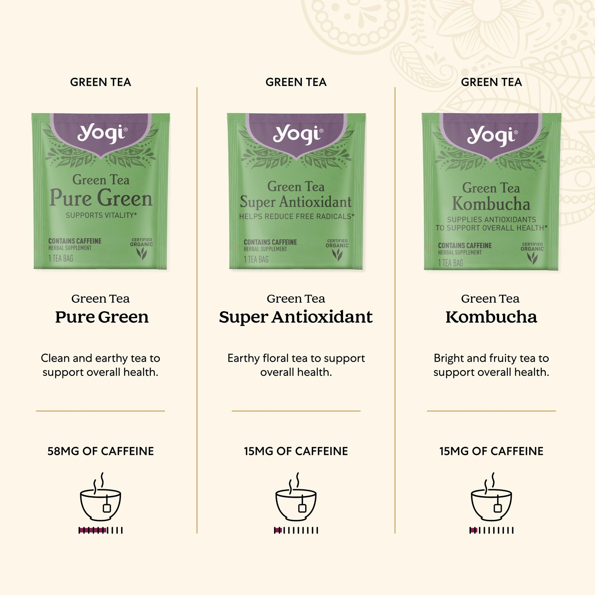 - Yogi Energy Tea Sampler Box: This energy variety pack includes Yogi Green Tea Pure Green, Yogi Green Tea Super Antioxidant, Yogi Green Tea Kombucha, Yogi Peach Bergamot Bright Day, Yogi Soothing Rose Hibiscus Skin DeTox, Yogi Spiced Blackberry Focus, Yogi Sweet Tangerine Positive Energy, and Yogi Vanilla Spice Perfect Energy