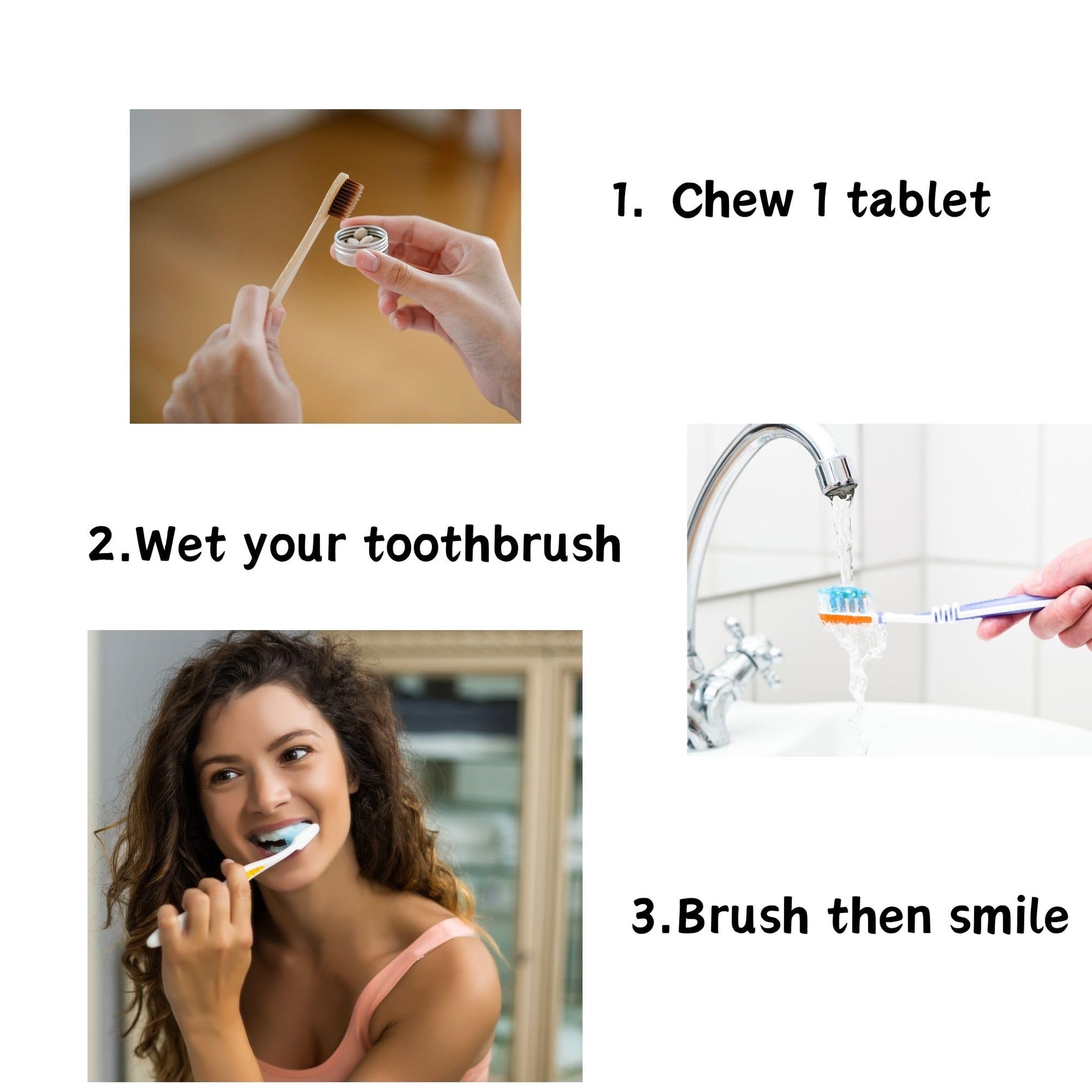 - HOW TO USE - Pop a tablet in your mouth, chew it up, wet your toothbrush before brushing as usual. Rinse, spit out and then smile.