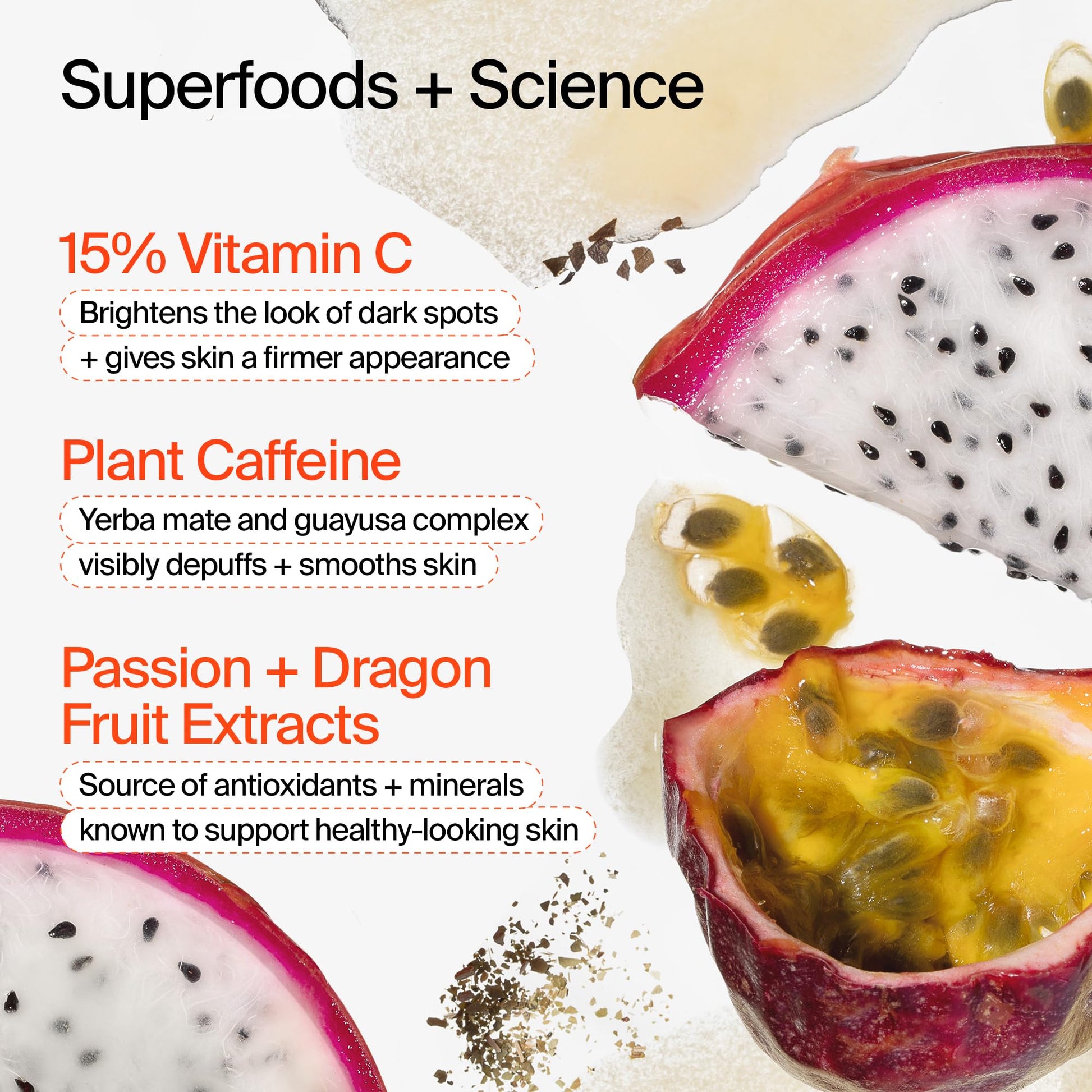 - WHAT IT IS – Brighten and firm skin’s texture with our clinical grade 15% vitamin C serum. Enriched with plant-derived caffeine from yerba mate and guayusa, it brightens, reduces puffiness, and revives dull skin