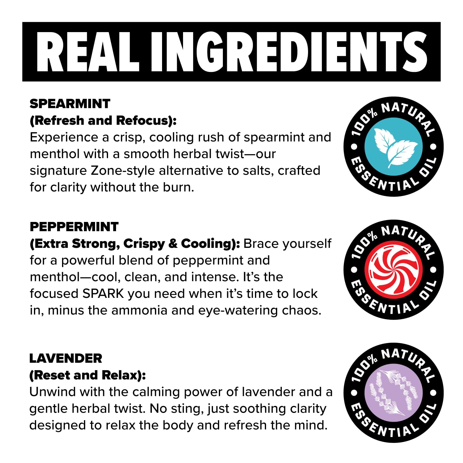 - Refresh, reset, and relax with our signature trio. Get the crisp snap of Peppermint, the cooling rush of Spearmint, and the calming clarity of Lavender—all with our smooth herbal twist. Whether you're powering through a workout or winding down after one, this 3-pack delivers the Zone-style lift without the burn.